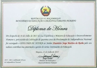 Recebeu um Diploma de Honra a 23 de Julho de 2015 do Ministro de Educação e Desenvolvimento Humano Doutor Jorge Ferrão por ocasião da celebração dos 40 anos da reclamação da Independência Nacional pelo seu valioso contributo na construção e gestão de várias Instituições de Educação.
